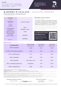 Fiche analyse LEMON OG CANDY - INDOOR PREMIUM | FLEUR DE CBD À INFUSER